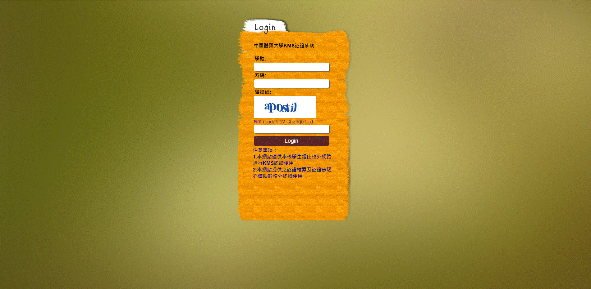 一、連線至 http://kms-proxy.cmu.edu.tw 輸入校園入口網站帳號、密碼及驗證碼,並按下「Login」登入。