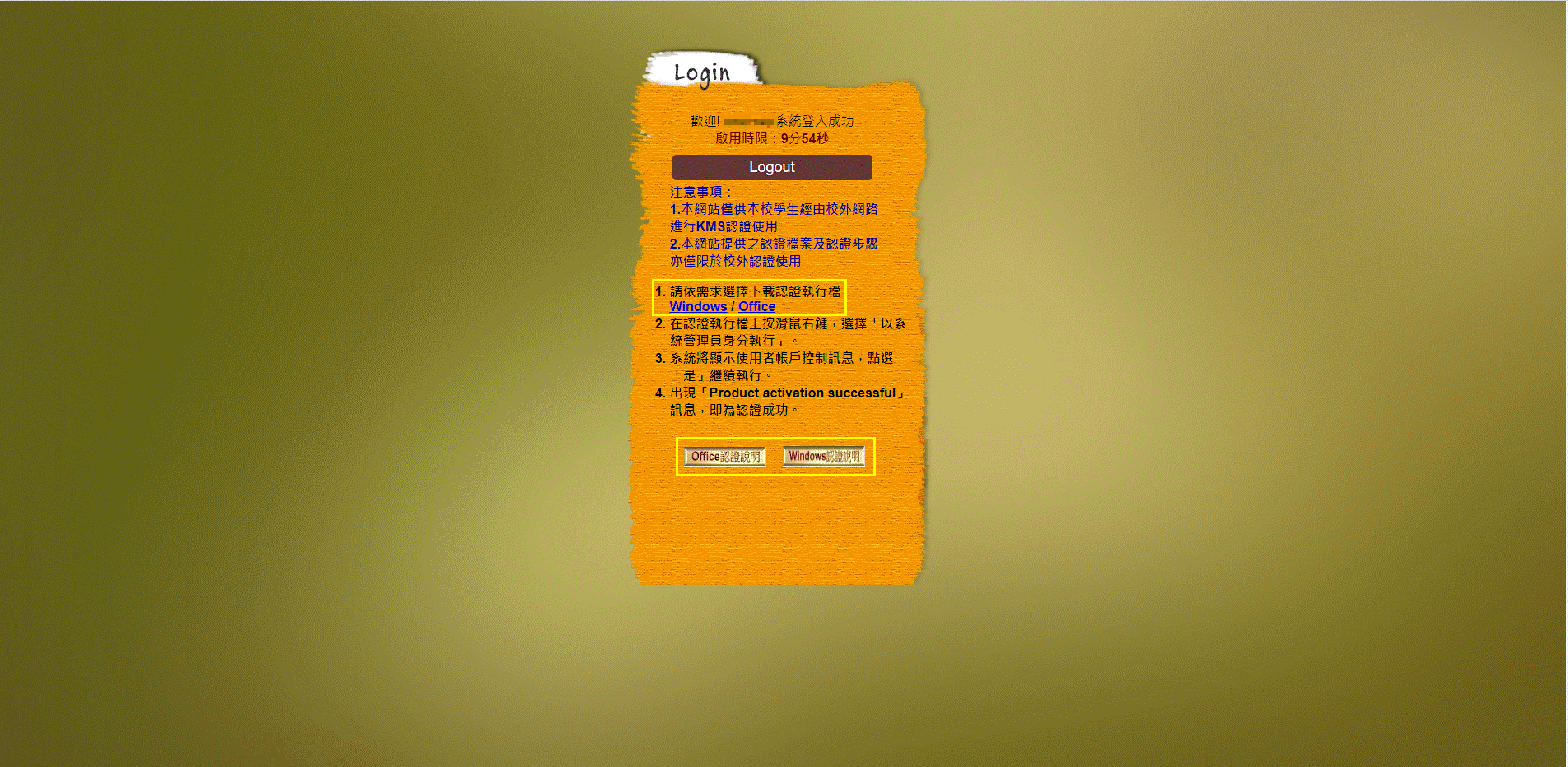 為提供校外學生使用 KMS 啟用服務,資訊中心已完成建立 KMS 代理服務 (kms-proxy), 登入方式:請使用【校園入口網站帳號及密碼】即可使用 KMS 啟用服務。 詳細使用方法如下: |
