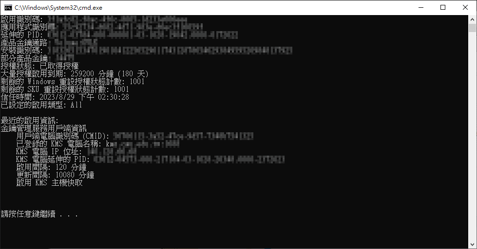 五、待程式執行完畢,按任意鍵繼續即可關閉執行視窗並完成啟用。 Windows啟用完成圖,如下圖