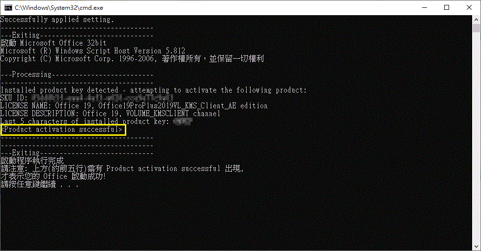 三、待程式執行完畢,按任意鍵繼續即可關閉執行視窗並完成啟用。
