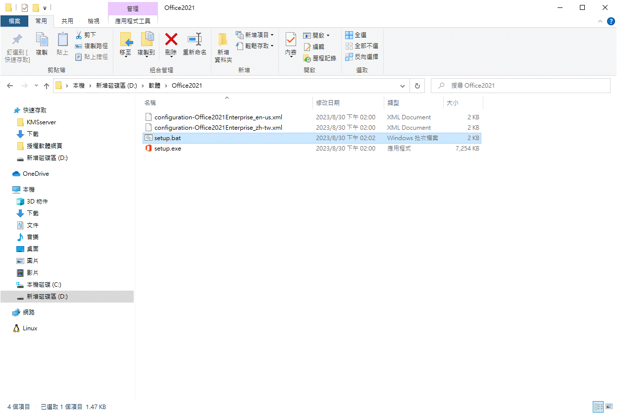 | 一、下載LTSC專業增強版 2021安裝檔 中英文64bit 解壓縮並直接按左鍵執行【setup.bat】檔案。 |