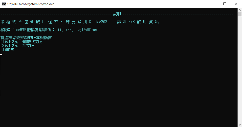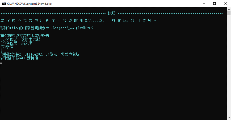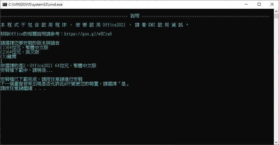 | 二、執行程式後請選擇想安裝的版本與語言,直接使用鍵盤數字鍵選擇。 選擇完後等候程式自動下載Office安裝檔。 下載完成後會顯示【安裝檔已下載完成】,按任意鍵繼續安裝。 |