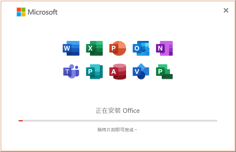 | 三、Office 2021會自動執行全安裝,等待安裝完畢,會顯示已完成安裝Office,按【關閉】即可結束安裝程式。 | ![]() ![]() |