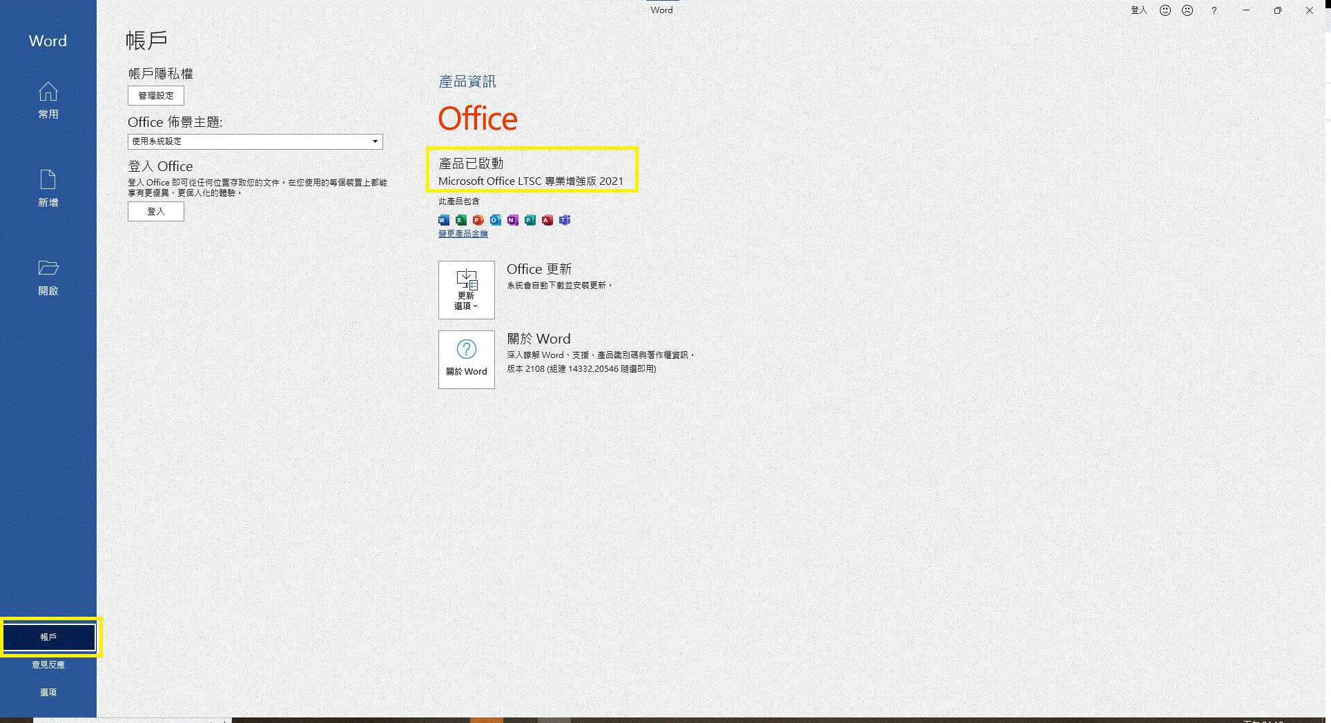 | 四、開啟Office任一應用程式,點選左下角【帳戶】查看產品資訊,是否顯示【產品已啟動】,如果顯示產品未啟動,請參考 校內啟用步驟 校外啟用步驟 執行啟用檔啟動Office。 |